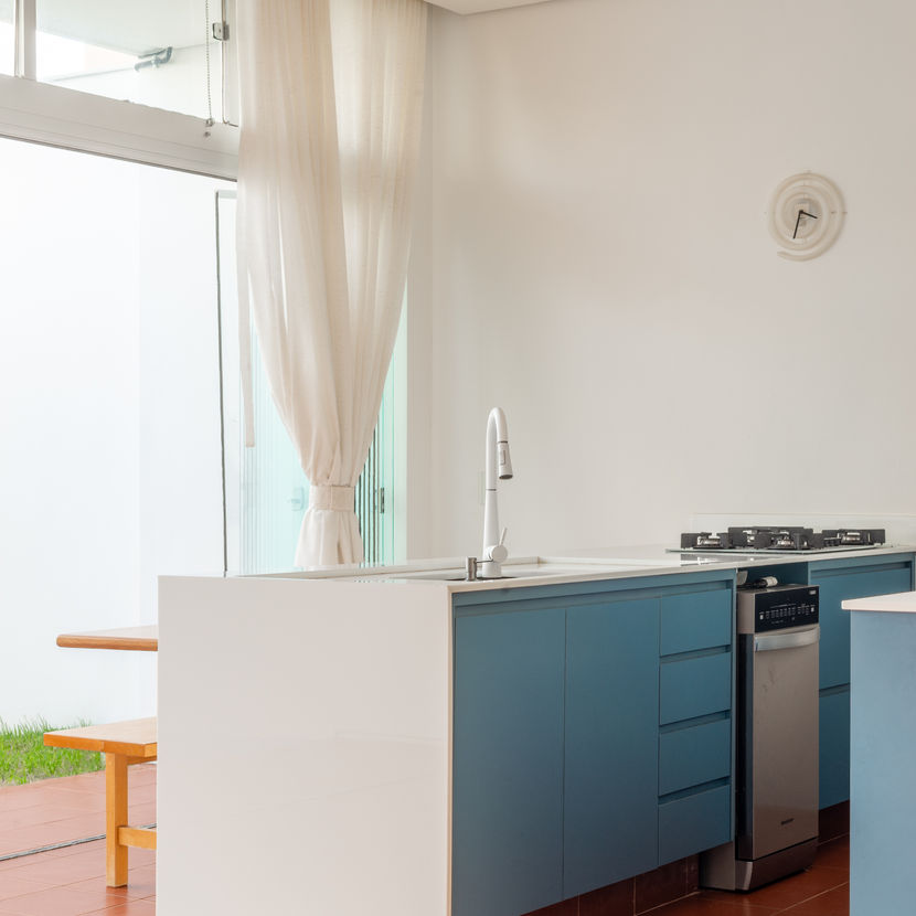 A organização dos espaços internos foi planejada para assegurar a ventilação cruzada e a iluminação natural.