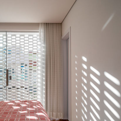 No pavimento superior, estão dispostos três quartos: a suíte, voltada para o fundo e com vista para o parque, e os outros dois quartos voltados para a rua, junto à uma parede de cobogó que oferece iluminação filtrada ao mesmo tempo que “esconde” a vista menos interessante sem comprometer a ventilação e iluminação.